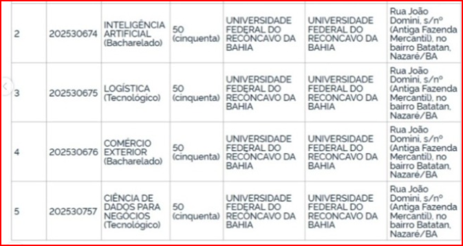 O novo campus da UFRB em Nazaré foi oficialmente credenciado pelo MEC em março de 2026, com início das atividades previsto para 2027 no bairro Batatan. Focado em tecnologia e logística, o campus oferecerá cursos de Inteligência Artificial, Logística, Comércio Exterior e Ciência de Dados para Negócios, impulsionando a educação superior no Recôncavo .